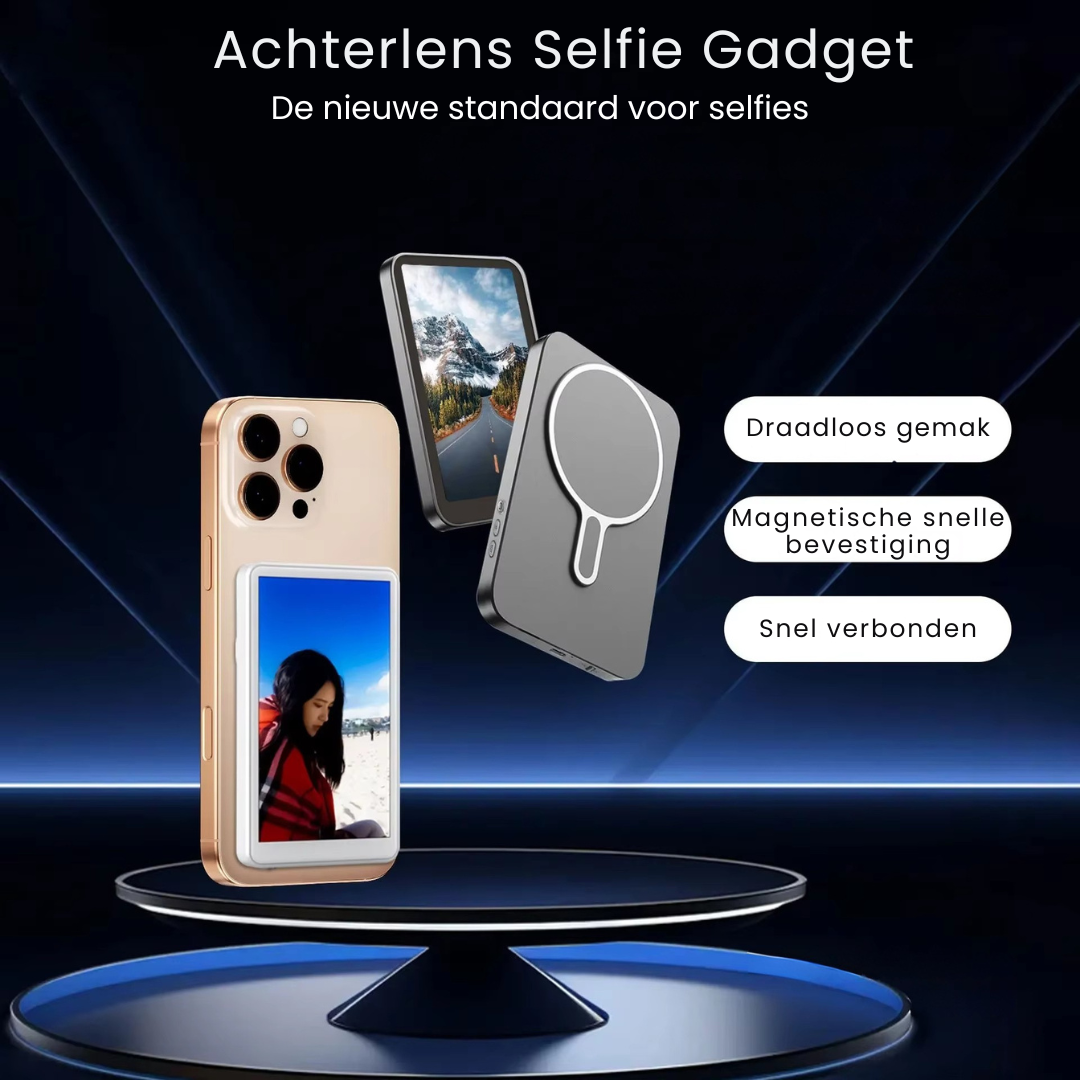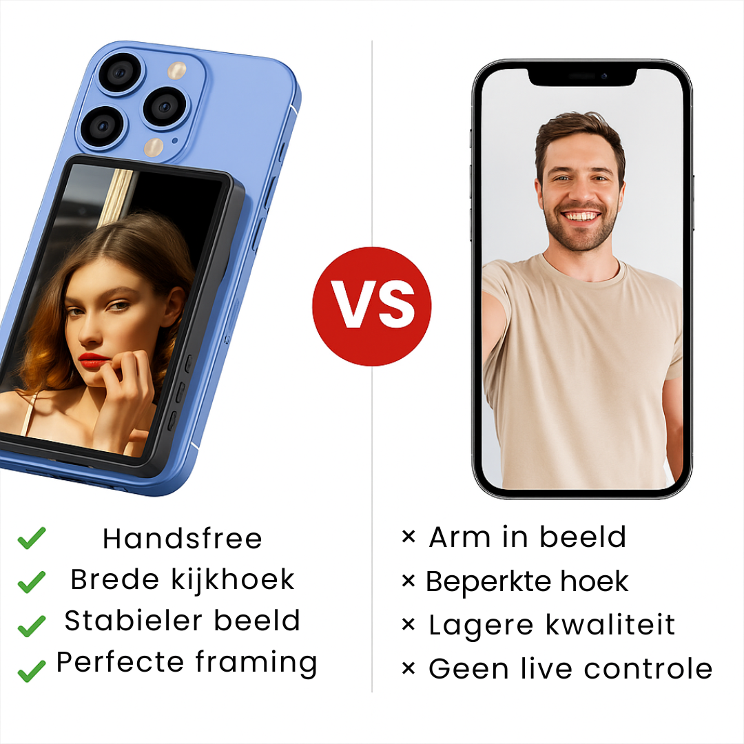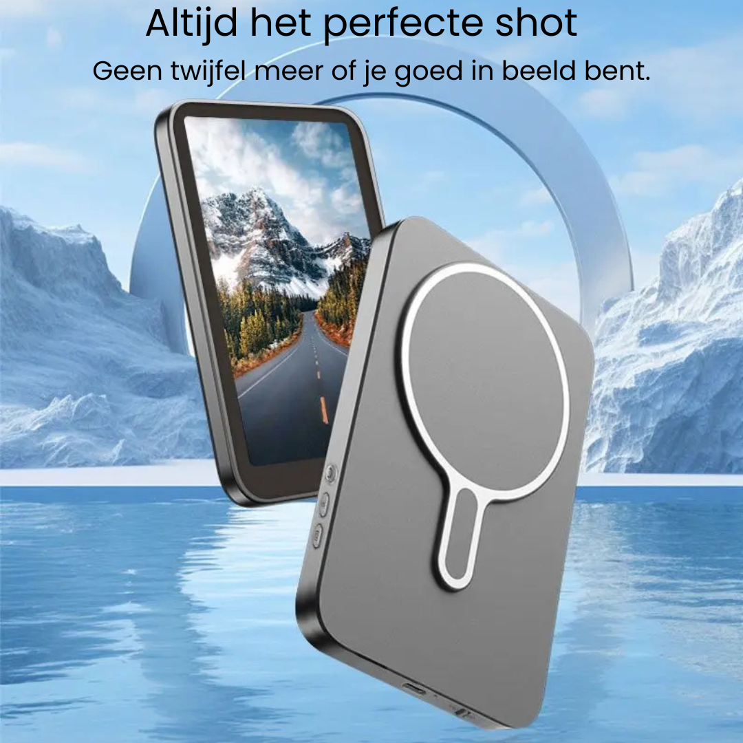 Wil jij jezelf professioneel filmen of fotograferen zonder hulp van een cameraman? Wil je haarscherpe video’s maken met je achtercamera terwijl je precies ziet wat je opneemt? De #1 beoordeelde SelfiQ biedt de perfecte oplossing! Dankzij de magnetische bevestiging zie je jezelf live in beeld, altijd perfect in frame, draadloos en zonder gedoe.